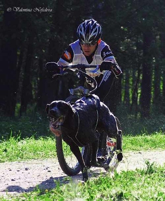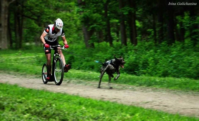 Najpierw Scooter (hulajnoga z dwoma psami), ale my podpięliśmy tylko po jednym: ja Ozziego, a Olgierd Nellę. Potem bikejoring (kolarz i pies) na nieco ponad 5-kilometrowym dystansie: ja z Dodą, a brat z Barbie.